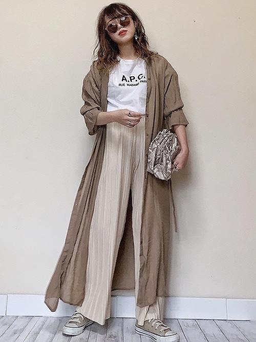 ブラウンのロングワンピースを前開けでシャツのように着こなし、ベージュのワイドパンツにベージュのオールスターでカジュアルダウンしたアースカラーで統一したコーデ。とってもオシャレが上手なコーデです。